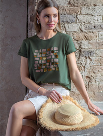 Акция Vilatte Футболка из эластичного хлопка с принтом стразы D49.097 т.оливков